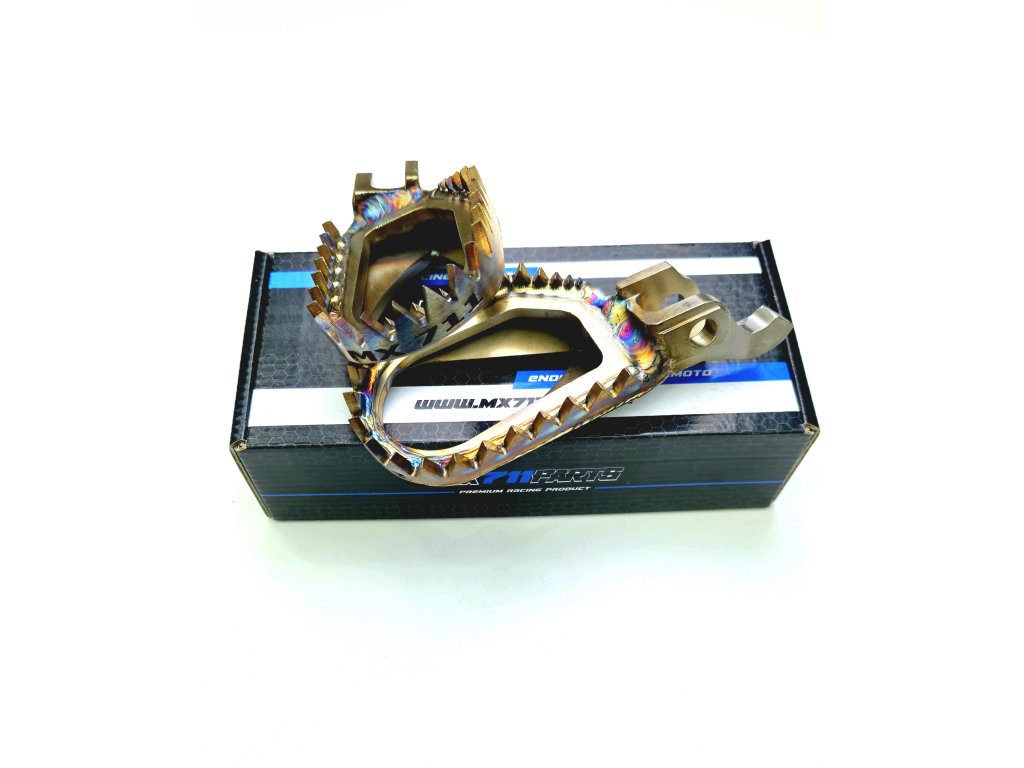 The new MX711pegs NERO 2.0 features a 98×63 mm platform with 19 tall teeth for outstanding grip even in extreme conditions. The stainless steel construction is 30% stiffer than the previous model. Thanks to a 7% upward tilt, the rider’s feet are naturally pushed closer to the bike’s frame for better control. The mount is CNC-machined for precise fitment. Custom engraving available. Offset adjustable up to -10 mm down and -8 mm back on request.