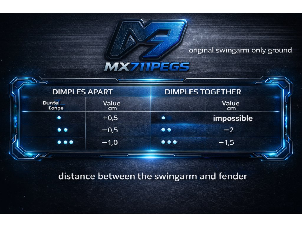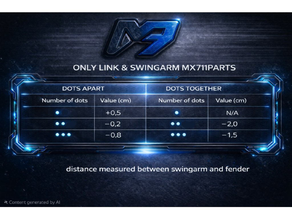 Rameno umožňuje změnu výšky zadní části motocyklu pomocí tří excentrických vložek, které lze (v závislosti na kombinaci) osadit ve dvou různých orientacích – tečky u sebe / tečky od sebe. Díky tomu je k dispozici až 6 různých výškových nastavení, včetně možnosti zvýšení motocyklu o +5 mm pomocí vložky s 1 tečkou.