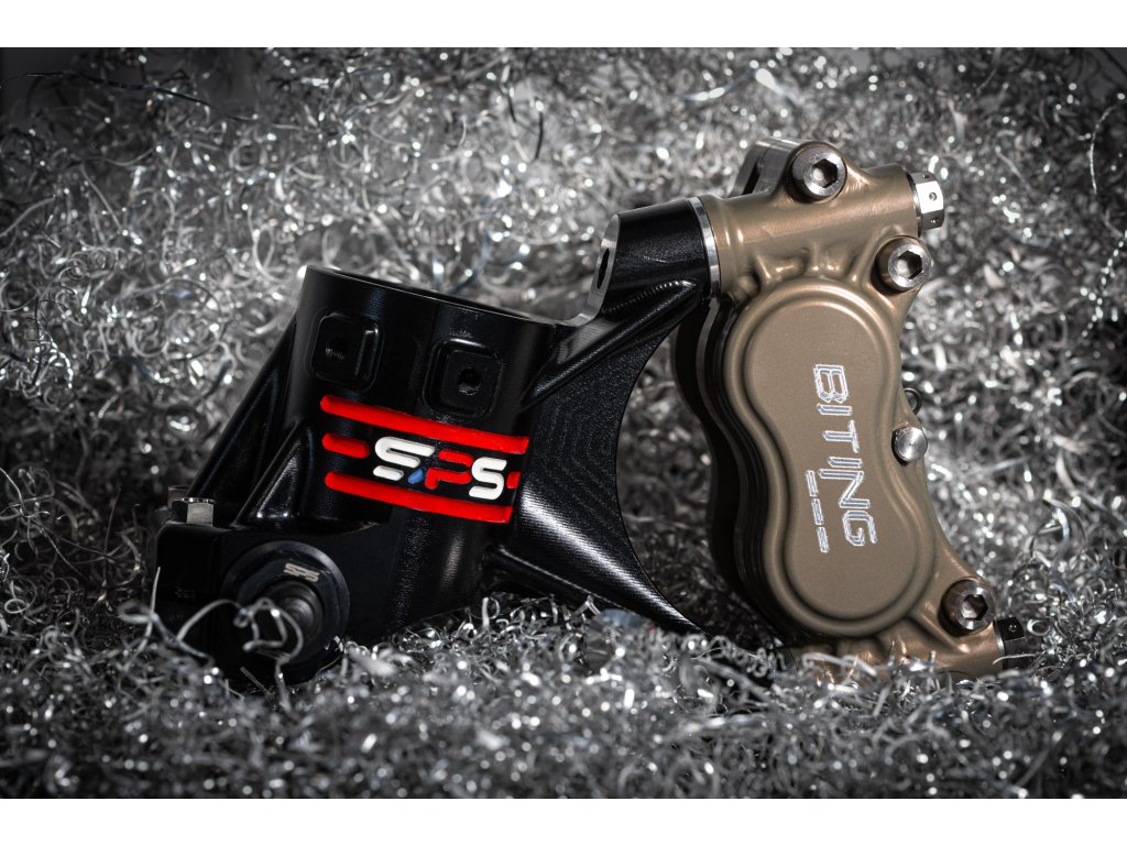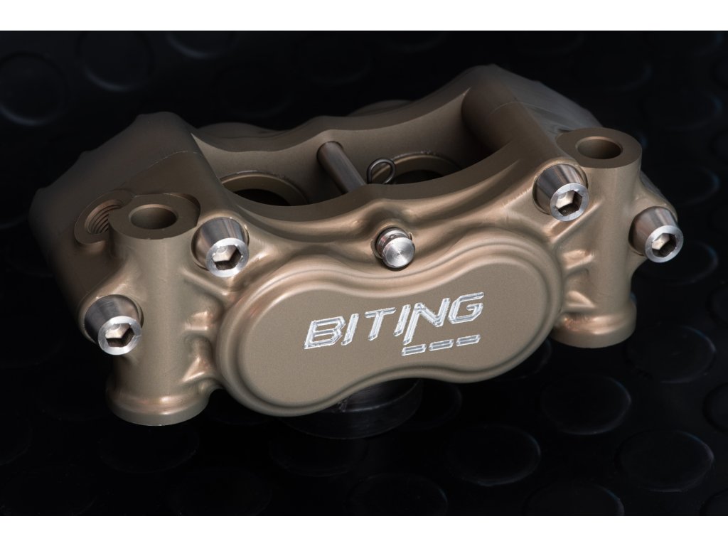 Nový 108mm přední brzdový třmen, kompletně obrobený ze 2 kusů, rozměry a hmotnosti výrazně snížené ve srovnání s litými výrobky. Centrální čep pro použití destiček nižší třídy, které dokonale odpovídají nové generaci kotoučů o tloušťce 300 mm a 6 mm, ale samozřejmě je lze použít i s jakýmkoli jiným typem kotoučů. Čepy s diferencovaným průměrem pro zajištění brzdné síly a zároveň vynikající modularity. Silný elox pro vysokou životnost a odolnost.