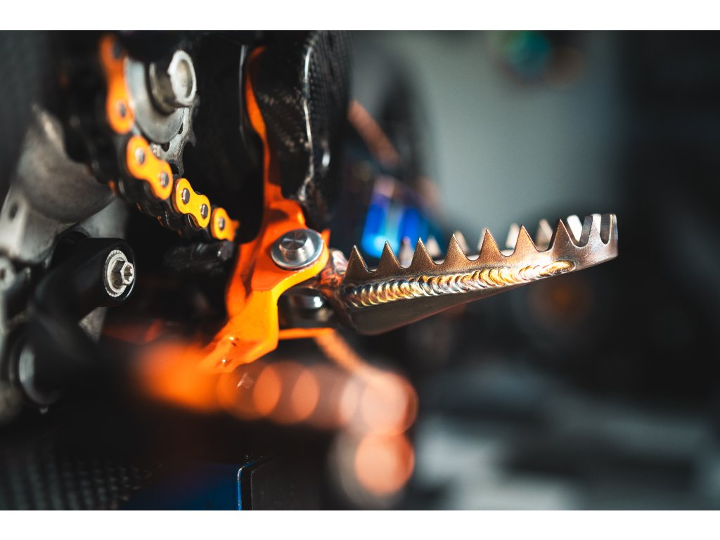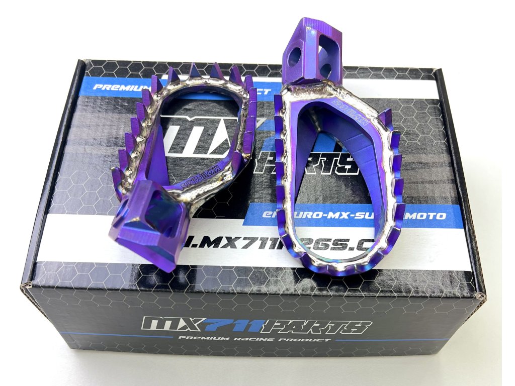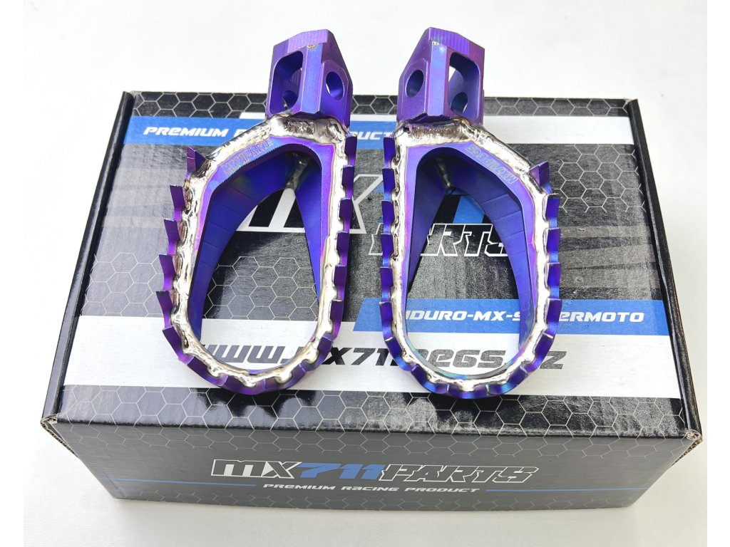 Profesionální titanové stupačky vyrobené z 4mm titanu s extrémní odolností a maximálním gripem. Délka od konce držáku po konec stupačky je 104 mm, šířka 63 mm – díky tomu jde o největší dostupné stupačky s největšími zuby na trhu. Osazeny 17 extra velkými titanovými zuby pro maximální stabilitu i v nejnáročnějších podmínkách. Možnost nitridace a gravírování loga na přání. Kompatibilní s KTM, Husqvarna, GasGas, Beta a Stark VARG.